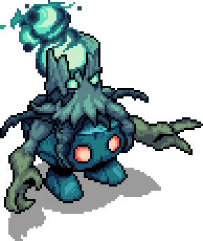Arentee consists of a living boulder and a haunted tree stump holding onto it with its roots. The boulder has two feet made out of smaller rocks and a pair of eyeholes that glow orange. The tree stump has a dark wood and green-ish bark. Two of its roots are shaped like three-fingered hands and used accordingly, while a different pair sticks out from behind them, making it appear bigger. The right half of the stump is missing most of its wood, leaving its bark hanging over a slit above its shoulders. The slit reaches its right eye, that, like its counterpart, glows in the same teal-ish manner as a smoke that comes out of its head.