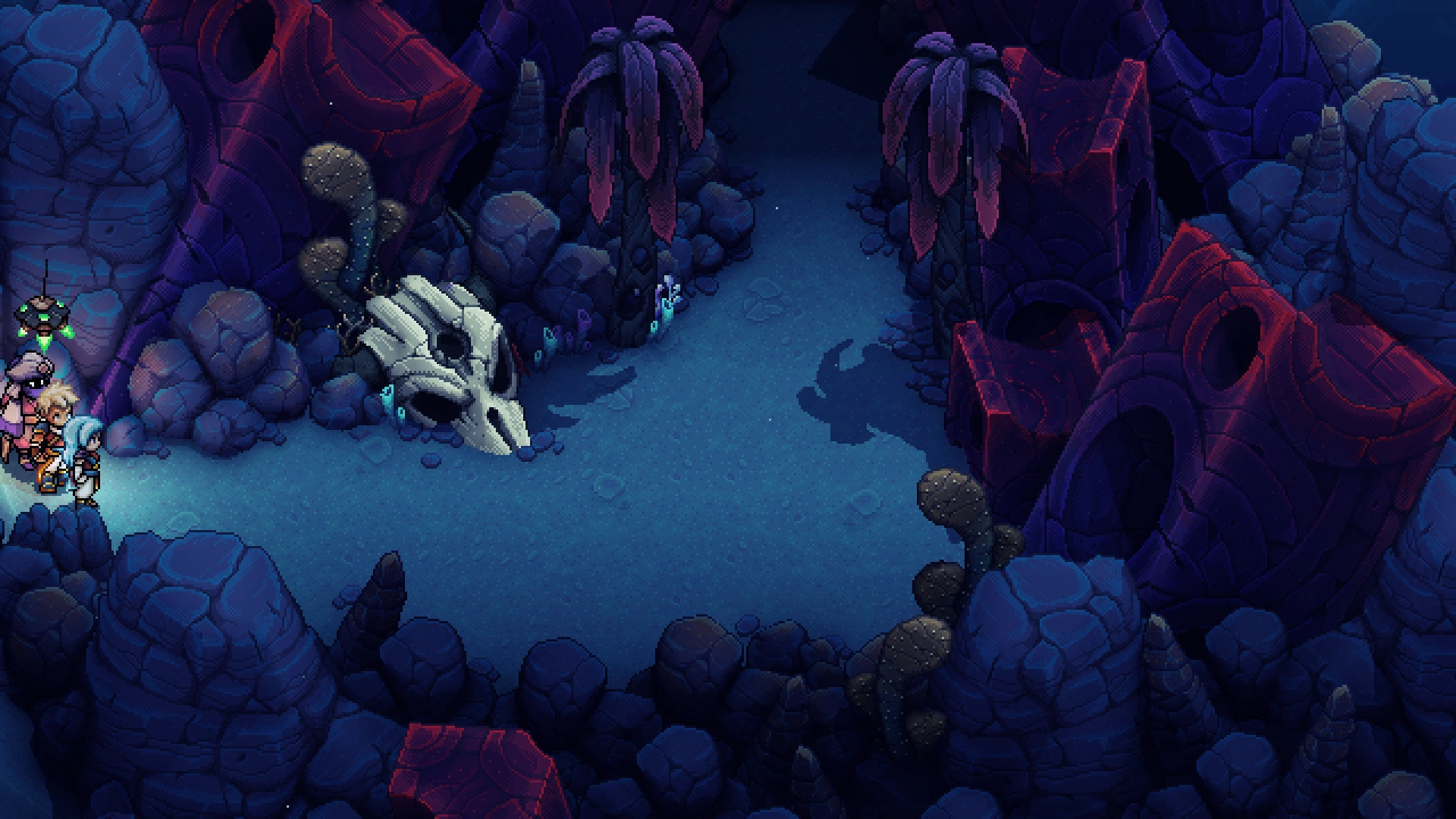 The Cerulean Expanse is a location in Sea of Stars. It is a desert maze that is traversed room-by-room in any cardinal or ordinal direction. Heading west at any point of the main section of the maze brings the player back to the starting entrance room.