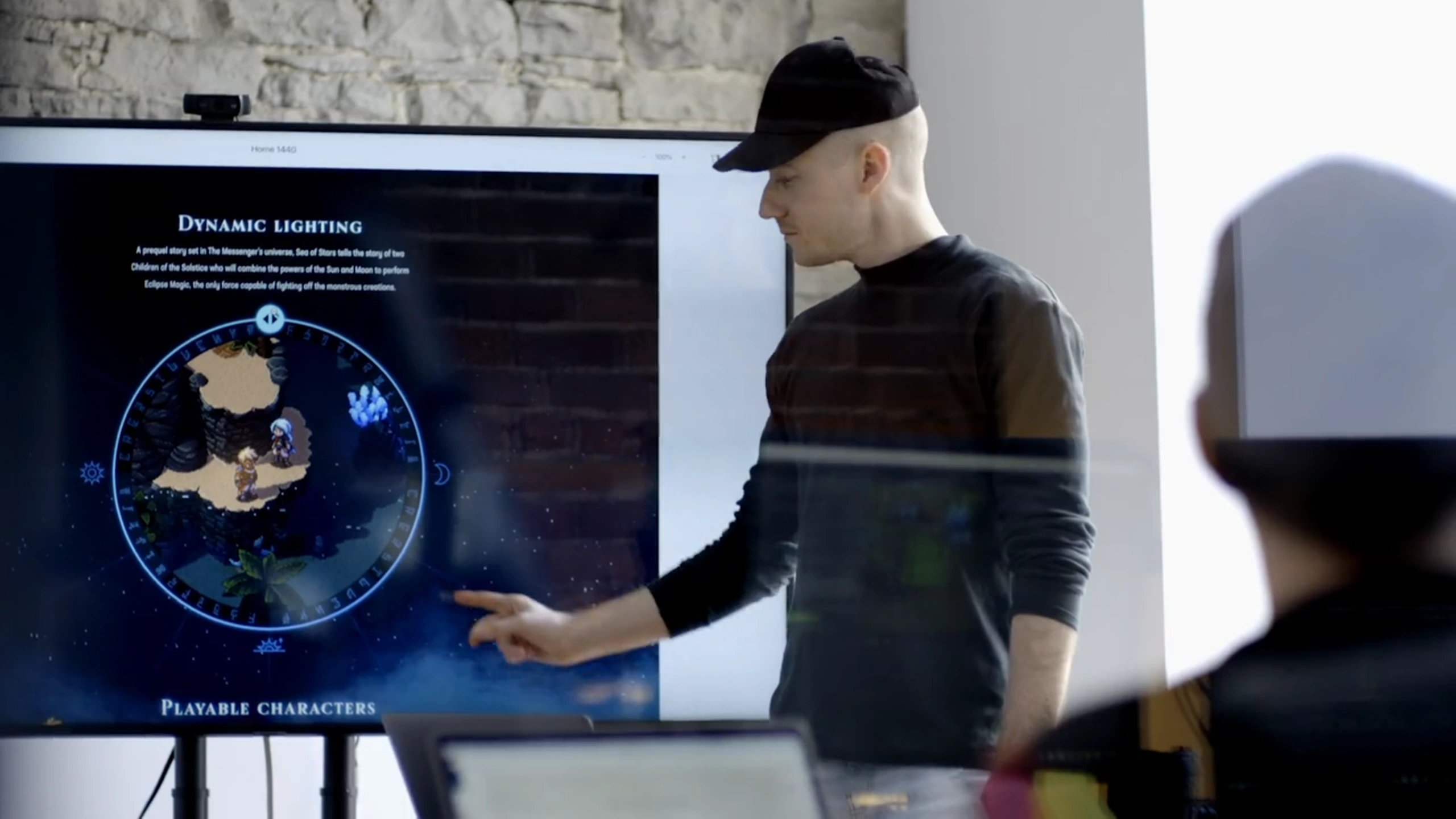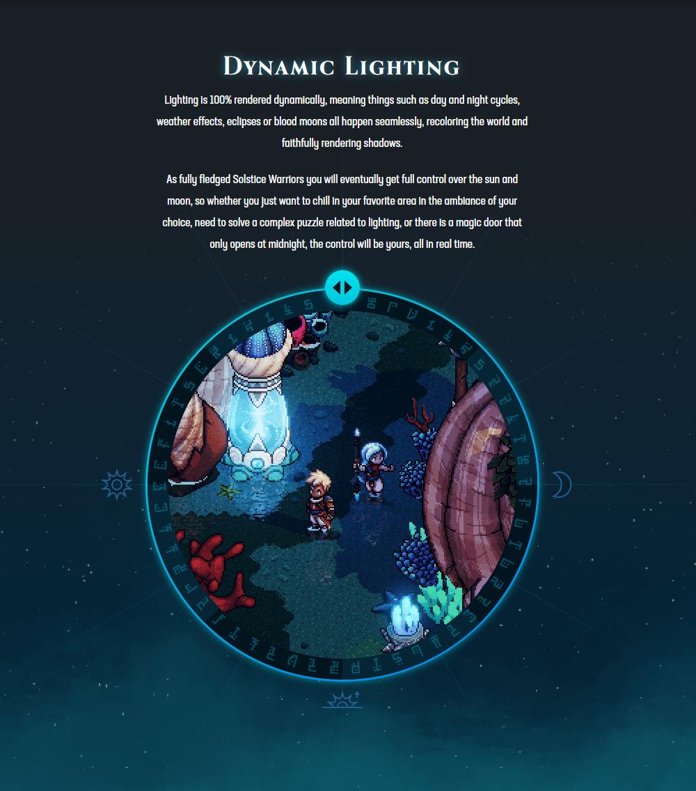 A "Dynamic Lighting" wheel containing alphabetic runes is showcased in the Sea of Stars Kickstarter trailer. Clockwise, it displays the letters B-M, O-Z, then repeats with B-M and O-Z again.