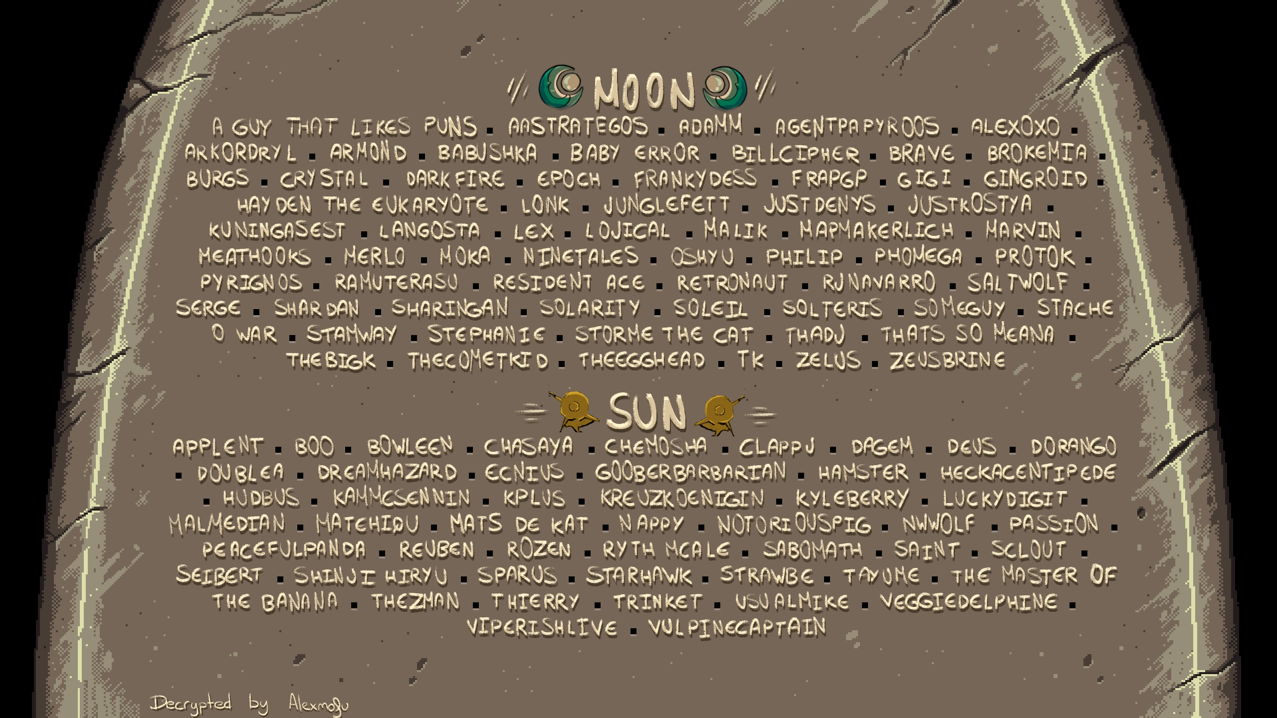 The in-game trophy is a stone tablet located within Headmaster Moraine's office in Zenith Academy. The names, which are encoded in runes, are beneath two groups labeled "MOON" and "SUN" for the respective teams.